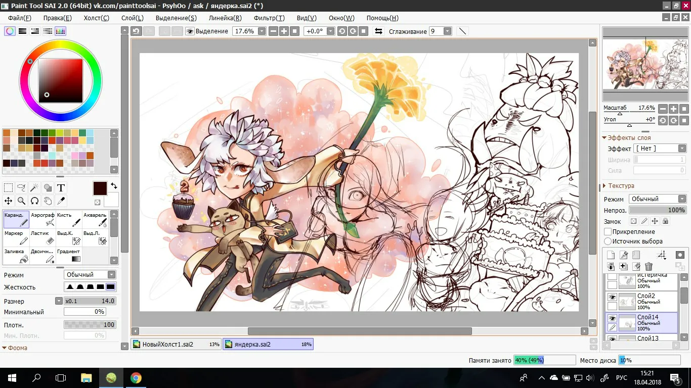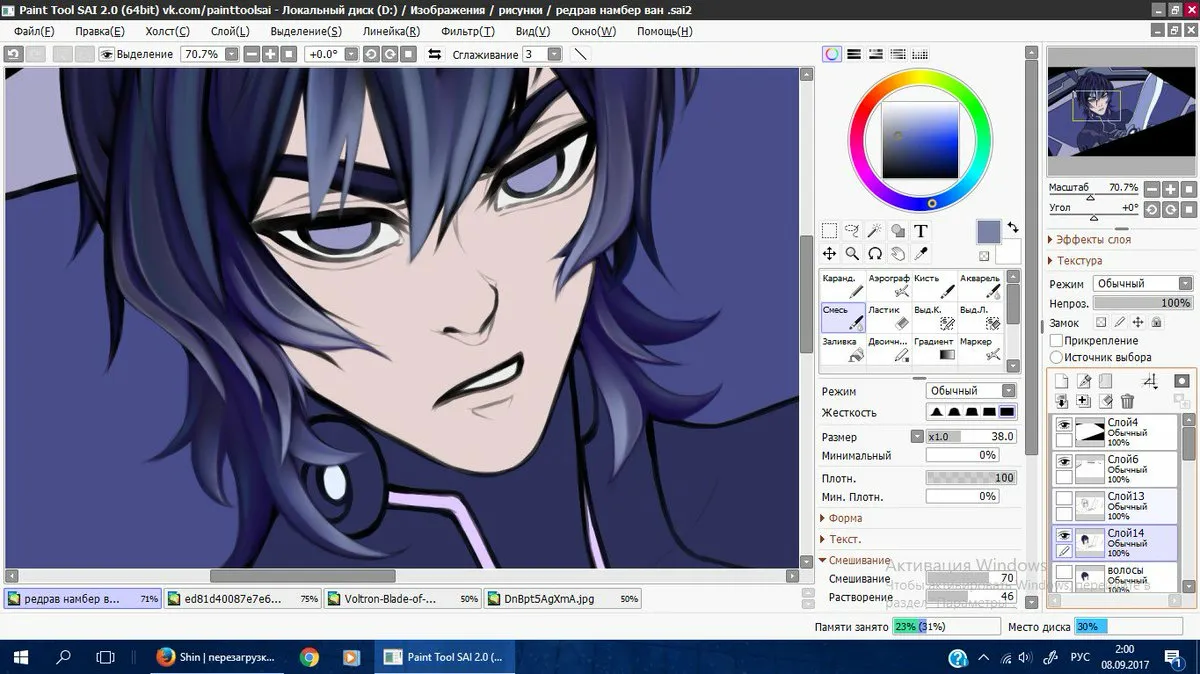 Преимуществом Paint Tool SAI можно считать его небольшой вес и скорость работы. В отличие от тяжеловесных профессиональных редакторов, программа запускается мгновенно и позволяет работать даже на старом или слабом железе. В приложении реализован механизм горячих клавиш, что повышает удобство использования: комбинации аналогичны комбинациям в Photoshop.